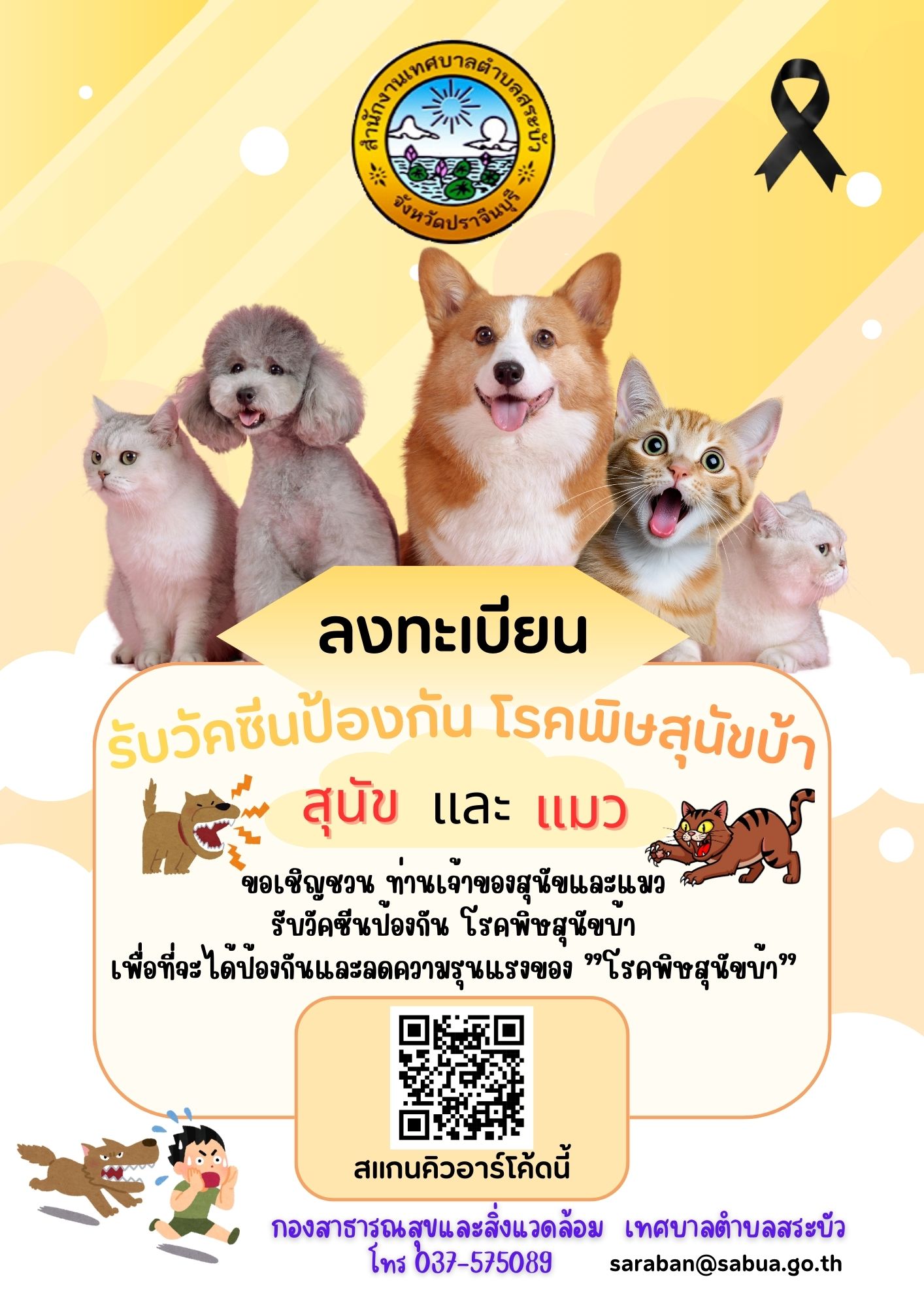 เทศบาลสระบัว เปิดรับลงทะเบียนสุนัขและแมว เพื่อขอรับการฉีดวัคซีนโรคพิษสุนัขบ้า ประจำปีงบประมาณ 2569